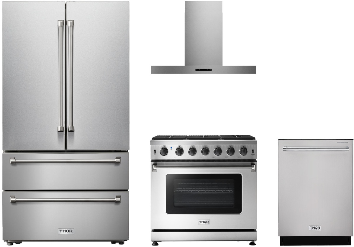 Thor Kitchen® 4 Piece Stainless Steel Kitchen Package with a freestanding gas range, French door refrigerator, built in dishwasher and wall mounted range hood.Read More