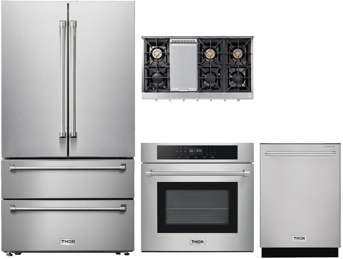 Thor Kitchen® 4 Piece Stainless Steel Kitchen Package with a French door refrigerator, gas rangetop, single electric wall oven and built in dishwasher.Read More