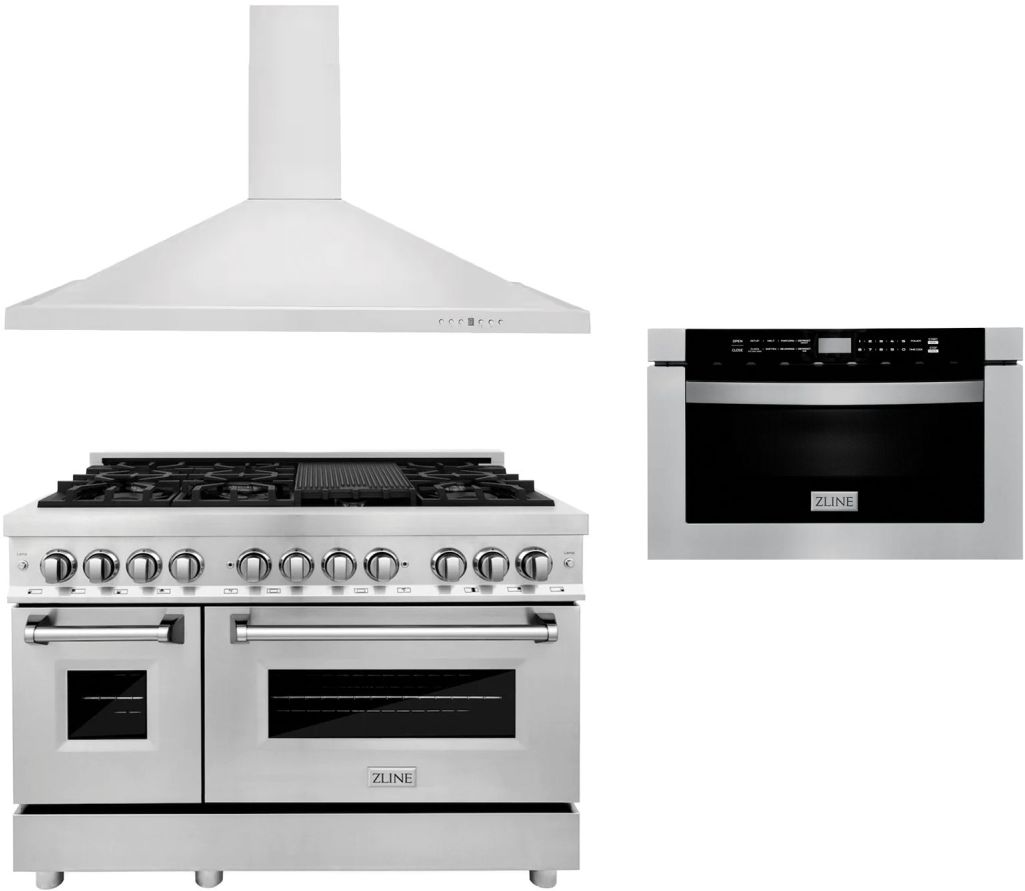 ZLINE 3 Piece Stainless Steel Kitchen Package with freestanding dual fuel range, wall mounted range hood, and a microwave drawerRead More